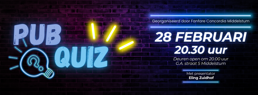 Kom gezellig naar de pubquiz op zaterdag 28 februari en strijd met je team voor mooie prijzen! Deze avond wordt gepresenteerd door Eling Zuidhof, hij brengt gegarandeerd gezelligheid met zich mee.