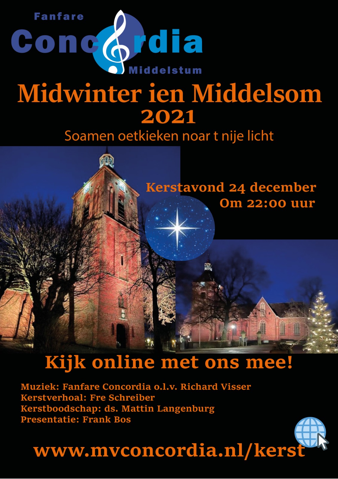Na het succes van het vorige online kerstspektakel ‘Midwinter ien Middelstom’ had Concordia haar zinnen dit jaar gezet op een live concert. Helaas is dat niet bewaarheid, maar niet getreurd. Ook in 2021 wil fanfare Concordia uit Middelstum deze altijd zo gezellige periode muzikaal invullen, ondanks alle maatregelen. We hebben daarom een nieuwe versie samengesteld van onze kerstvoorstelling met bestaande muziek, een kerstboodschap en een verhaal. De uitzending vindt online plaats op Kerstavond 24 december om 22:00 uur.